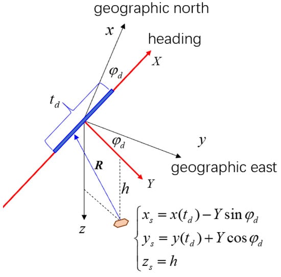 Furthermore, we can convert the continuous strip image of (26) into a regional image on the global geographic coordinate system as steps forward. As shown in Figure 2, if the longitude, latitude, and height given by the onboard GPS are , the position of the detecting platform in the geocentric coordinate system is []