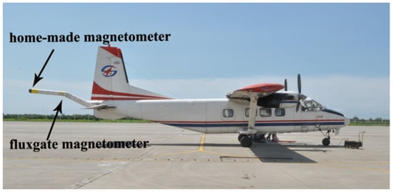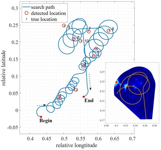 On-site experiments were conducted to validate the applicability of the proposed procedure. Figure 3 shows the magnetic detection airplane used for our experiments. As shown in Figure 4, a total of 10 artificial targets are assumed to be distributed in an area. The detection airplane is searching for the targets along a hovering forward course. The 10 targets are successfully found using the proposed procedure, as indicated in the figure. A 2D image of the region around the 9th target is placed on the side of the figure.