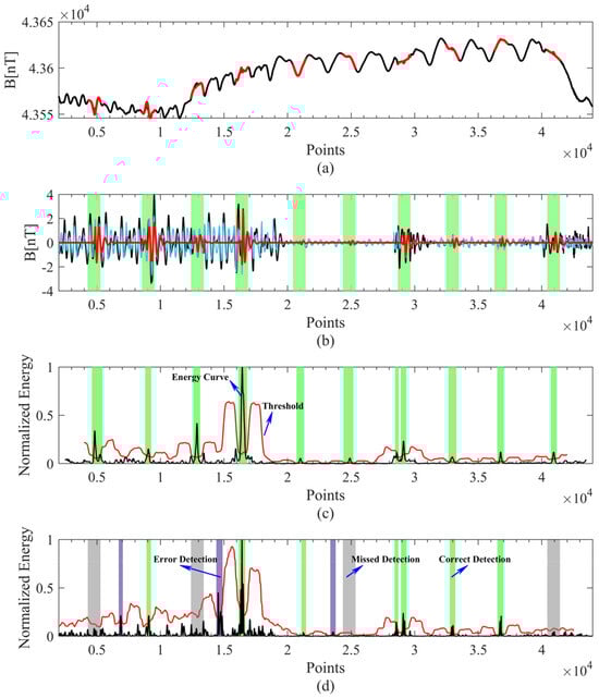 Raw data, preprocessed data, and detection results. (a) Raw data. The 10 red segments in the curve indicate the locations of 10 target signals. (b) Preprocessed data. The black line shows the direct bandpass filtering of the raw data; the cyan line shows the preprocessed data using the schemes described in Section 3.1; the red line shows the direct bandpass filtering of the target signal. (c) Detection results using the present ABFs method. The black line represents the energy curve; the red line indicates the threshold. When the energy value exceeds the threshold, the existence of a target signal at that point is indicated (green stripes). (d) Detection results using the OBFs method. The gray stripes represent missed target signals; lilac stripes represent falsely detected target signals; and green stripes indicate correctly detected target signals.