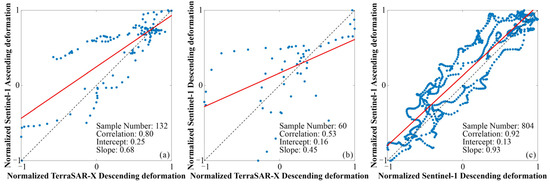 Correlation analyses of normalized vertical deformations: (a) Sentinel-1 ascending vs. TerraSAR-X descending datasets; (b) Sentinel-1 descending vs. TerraSAR-X descending datasets; (c) Sentinel-1 ascending vs. Sentinel-1 descending datasets. The red line indicates linear fitting, while the black dashed line represents a reference line with zero intercept and a slope of one. Blue dots signify the normalized deformations.