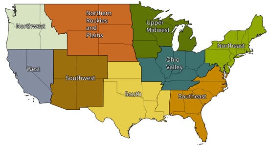 Nine climatically consistent regions within the U.S., defined by NOAA “Reprinted from National Centers for Environmental Information”.