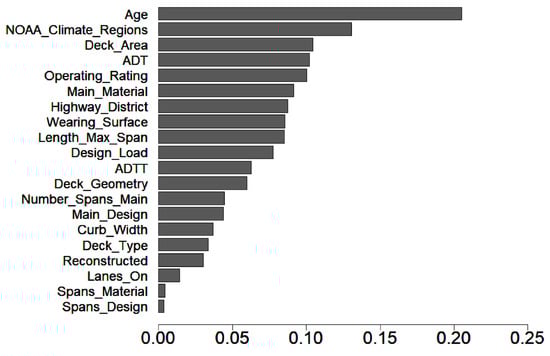 Sampling with replacement, available in the ranger package, version 0.13.1, was introduced by Wright and Ziegler [54]. This feature has led to the creation of a variable importance plot, which ranks the predictor variables based on the reduction of model accuracy if their associated values are permuted. Figure 6 shows the variable importance plot using the permutation-based variable importance approach. According to Figure 6, the most contributing predictor variable in determining deck condition rating is the age of a deck or the number of years since the last major reconstruction. It is noteworthy that climate regions (NOAA_Climate_Regions) and traffic (e.g., ADT and ADTT) are recognized as influential variables contributing to the deterioration of bridge decks. Additionally, other variables, representing various characteristics of bridge decks, are identified to influence the predictive performance of the deterioration models. These variables include Deck_Area, Operating_Rating, Main_Material, Highway_District, Wearing_Surface, Length_Max_Span, Design_Load, Deck_Geometry, Number_Spans_Main, Main_Design, Curb_Width, Deck_Type, Reconstructed, Lanes_On, Spans_Material, and Spans_design.