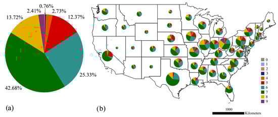 The distribution of bridge decks with different condition ratings, from 0 to 9 (a) in the United States and (b) in each state.