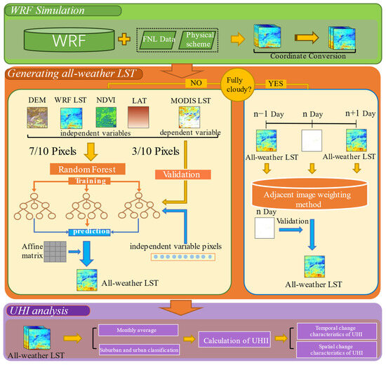 - Zhang, X.; Chen, W.; Chen, Z.; Yang, F.; Meng, C.; Gou, P.; Zhang, F.; Feng, J.; Li, G.; Wang, Z. Construction of cloud-free MODIS-like land surface temperatures coupled with a regional weather research and forecasting (WRF) model. Atmos. Environ. 2022, 283, 119190. [Google Scholar] [CrossRef]