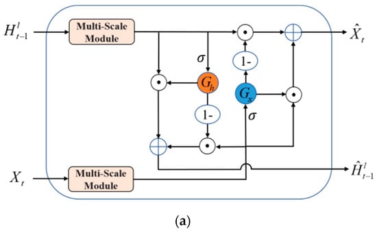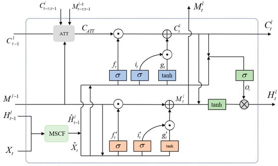 where “MSCF” denotes the multi-scale context fusion module; “ATT” denotes the attention module; is the first input gate; is the first input modulation gate; is the first forgetting gate; is the second input gate; is the second input modulation gate; is the second forgetting gate; is the output gate; denotes the updated temporal memory unit; denotes the updated spatial memory unit; denotes the corresponding convolution kernel; and denotes the corresponding deviation value. “*” denotes the 2D convolution operation, “⊙” denotes the Hadamard product and is the historical time step. In particular, in the ATT equation, when l = 1, , .