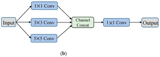 where “∗” denotes two-dimensional convolution, “W” denotes the weight matrix and “Concat” denotes channel stitching. From this equation, the inputs in the MCA-LSTM model are and . Convolution operations are performed on the inputs and using convolution kernels of 1 × 1, 3 × 3 and 5 × 5 sizes. This is used to help the contextual information extract detailed features at different scales. Channel concatenation is performed separately, followed by convolutional operations to restore the channels, resulting in the acquisition of the current input and the previous hidden state , both enriched with multi-scale feature information.