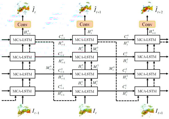 The network structure of the MCA-LSTM model is presented in Figure 4. This network is constructed by stacking four layers of MCA-LSTM cells, in which the spatial storage cell M (shown by the black dashed line) is updated in the zigzag direction and the temporal storage cell C (shown by the black solid line) is updated in the horizontal direction, and the top layer outputs the prediction results .