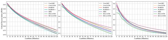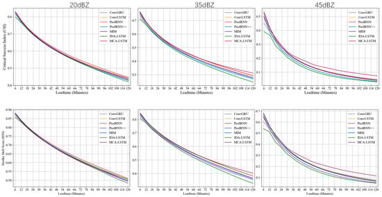 To better illustrate the results, curves for CSI, HSS and POD at different forecast moments (6–120 min) are shown in Figure 6 to show the performance of the various models at different time steps. It can be seen that within the first hour of the prediction time, the variability between the networks is not significant. Even at the threshold of 20 dBZ, our model has no significant advantage, and our model becomes more and more advantageous as the prediction time goes on, due to the fact that MCA-LSTM incorporates a multi-scale context fusion module and an attention module, which fully extracts spatio-temporal information at different scales to improve contextual relevance; the attention module can perceive more temporal dynamics from a wider sensory domain, reducing information forgetting and better modelling of short-term and long-term dependencies. As a result, MCA-LSTM can better retain the detail of the prediction results and perform better in the strong echo region. In addition, at higher thresholds, the results of PredRNN are not as good as the model proposed in this paper. This is because PredRNN suffers from the problem of not fully extracting contextual relevance information and loss of memory unit information.