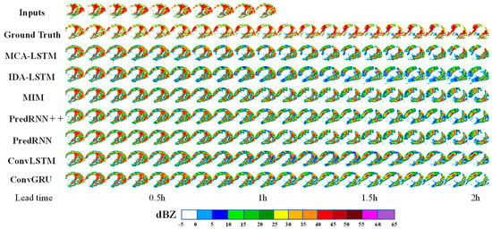 In order to better compare and understand the results, we visualized the extrapolation results of the radar echo from 8:00–10:00 a.m. on 2 April 2014 in Hong Kong from the China radar dataset, as shown in Figure 7. As can be seen from the figure, the prediction results within the first hour do not differ much between the methods, and all of them achieve good results. As the prediction time continues to increase, the extrapolation results of the ConvGRU, ConvLSTM and IDA-LSTM models gradually become blurred, the high echo region gradually becomes smaller or even disappears and the whole prediction boundary region is gradually smoothed. This is because ConvGRU and ConvLSTM pay attention to the time information of lateral propagation and lack attention to the spatial information between cell layers, which leads to the inability to model the spatio-temporal information well in long time series prediction. IDA-LSTM, despite the use of the self-attention mechanism, is still not able to aggregate the multi-step history information effectively, which leads to its failure to achieve good results in long-term prediction. Although PredRNN and PredRNN++ networks take into account the extraction and preservation of temporal and spatial information, MIM also considers non-smooth and nearly smooth characteristics. However, the forgetting problem in the information transfer process has not been effectively improved. Our proposed MCA-LSTM adopts multi-scale contextual information fusion to effectively extract multi-scale detailed spatio-temporal features, which improves the interaction capability between contexts. The attention module preserves more historical information by widening the time-receptive domain, which effectively improves the information decay problem. It effectively improves the prediction ability for high echo regions, and the details of the prediction results are also higher.