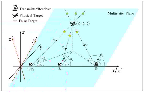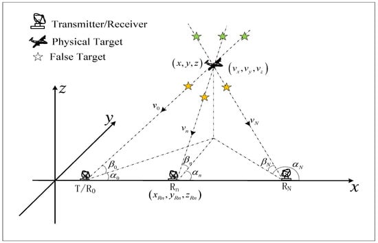 The radar electronic countermeasure (ECM) interferes with the normal operation of radar by confusing the physical targets (PTs) with the false targets (FTs) and/or drowning PTs in the interference signal, which seriously hinders the detection and tracking of the target [1]. With the application and development of digital radio frequency memory (DRFM), active deception jamming has become an efficient and widely used means of ECM. The repeater jammer performs the time delay, doppler and radar cross section (RCS) modulation on the intercepted radar signal to generate various false targets that resemble the physical target in multiple dimensions, such as range deception FT, velocity deception FT and range velocity joint deception FT [2,3]. The electronic counter-countermeasures (ECCMs) for active deception jamming have been developing from the early monostatic radar system to the distributed multistatic radar system [4,5]. Compared with the monostatic radar with limited resources, the multistatic radar system can perceive the environment from multiple dimensions and perspectives and benefits from fusion processing, therefore improving the performance on target detection [6,7], target tracking [8,9] and ECCM [10,11].