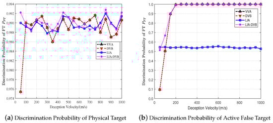 When there is a physical target and an active false target, the target combination composed of one target selected from each receiver has eight cases: H—one case, H—one case and H—six cases. At this time, the principle of successful discrimination of physical and false targets is defined as follows: only when the combination {PT, PT, PT} is finally judged as H, the physical target is considered successfully discriminated, and when any combination containing a false target is judged as H, the false target will be considered misjudged. It can be seen from Figure 4a that the discrimination probability of the physical target of LIA remains near the expected value, 99%. According to the algorithm principle, its discrimination performance has nothing to do with the deception velocity. On the other hand, for VVA and DVB methods, the discrimination probability of the physical target increases with the deception velocity, and finally remains around the expected value, 99%. When the deception velocity is small, the velocity of the false target is similar to that of the physical target, and there are cases where the target combination of physical and false targets passes the hypothesis test.