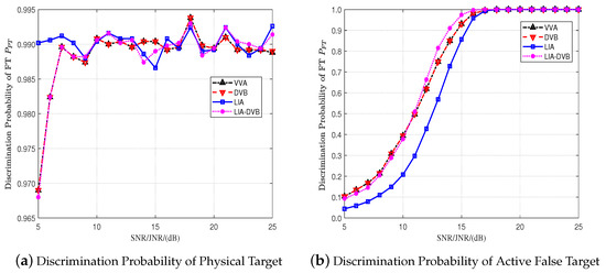 It can be seen from Figure 5a that the physical target discrimination probability of the proposed DVB method slightly deviates from the expected value of 0.99 mainly due to the high measurement error of radial velocity when the value of SNR/JNR is small and fluctuates in the vicinity of the expected value with the increase in SNR/JNR. The superiority of the proposed DVB method is more obvious in the discrimination of false targets, as shown in Figure 5b. Due to the combination of LIA and DVB, the LIA-DVB method can improve the discrimination performance with small deception velocity cases when each of them has a decent discrimination ability.