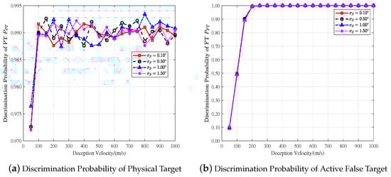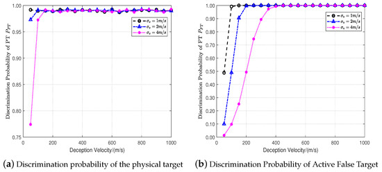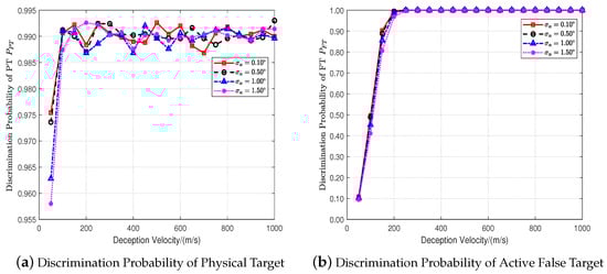 It can be seen from Figure 6a that when the value of deception velocity is small, the radar velocity measurement accuracy has a significant impact on the discrimination probability of the physical target, and the higher the velocity measurement accuracy, the better the discrimination performance for the physical target. However, with the increase in deception velocity, the discrimination probability of the physical target gradually increases and remains around the expected discrimination probability of . For the three cases of velocity measurement accuracy, when the deception velocity is not less than 100 m/s, the discrimination probability of the physical target has reached the expected level, and then the constant misjudgment property is maintained for the physical target. Compared with the physical target, the discrimination performance for active false targets is very sensitive to the velocity measurement accuracy as shown in Figure 6b. The higher the measurement accuracy of the deception velocity, the higher the discrimination probability of the active false target. This is because the order of magnitude of the target velocity is relatively small, and the velocity error of a small value will cause a large deviation in the calculated velocity vector.