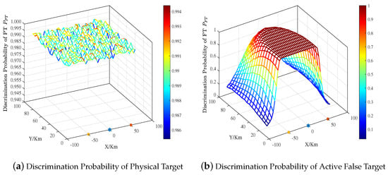 As shown in Figure 9a, within the illustrated airspace range, the discrimination probability of the proposed method is maintained at for the physical target, which is consistent with the expected constant misjudgment of the physical target. In Figure 9b, the high discrimination probability of the false target is mainly distributed in the area between two receivers, and radiates out from the baseline of the multistatic radar system, and the discrimination probability decreases with far distance. When the X coordinate of the target is less than the receiver R (i.e., km) or greater than receiver R (i.e., 50 km), the discrimination performance decreases sharply. This is mainly because the difference in the angle of the target relative to each receiver in the above region becomes smaller, which increases the deviation of the target velocity and the deception velocity solution.