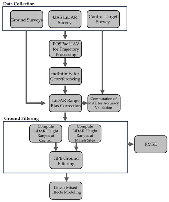To evaluate accuracy of UAS LiDAR-derived marsh ground height estimates, five different J. roemerianus marsh transects were surveyed using UAS LiDAR and an on-the-ground, rod-mounted, Global Navigation Satellite System (GNSS) roving receiver. Additionally, a control transect over asphalt and mowed grass was surveyed six times during the study to assess sensor performance. LiDAR flights were conducted at five altitudes at each site. Altitude-based correction factors were derived based on the control site. The GNSS field survey was conducted at 1 m intervals along each transect and included measurements of canopy height and water depth. Any unique site characteristics (e.g., flattened canopy, sparse canopy, presence of water channels, etc.) were recorded. After heights were corrected for flight altitude, point cloud datasets were classified using a novel ground estimation method. Finally, vertical accuracy was assessed by computing the Root Mean Squared Error, RMSE, of these LiDAR heights compared with the corresponding GNSS heights for both the classified and unclassified datasets. The major steps conducted in the methodology of this study are displayed in Figure 1.