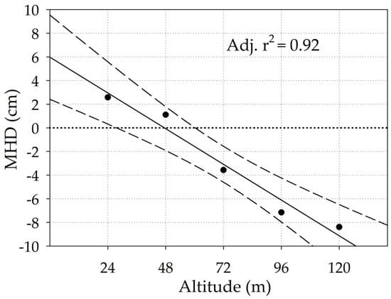 At altitudes below approximately 50 m, the LiDAR sensor consistently overestimated ground height, while underestimating ground height at altitudes above 50 m in comparison with the GNSS field survey measurements. Thus, correction factors were developed using the control site data. Due to discrepancies in the point density and intensity information between the grass and asphalt surface types, correction factors were developed using only returns from asphalt. To account for differences in height that were observed among sampling dates owing to variation in atmospheric conditions and satellite ephemeris information, six sets of control data were used for correction factor generation. To generate correction factors, all sets of control data were merged. For each altitude, 500 random LiDAR samples were taken from the asphalt portion of the transect from within a 0.5 m distance (buffer) from the GNSS field survey measurements. The height difference between the mean LiDAR height (l−) and GNSS measurement height (g) was computed for LiDAR samples within each buffer. These height differences were then averaged to compute the mean height difference (MHD) for each altitude (a) using the total number of data points (N):