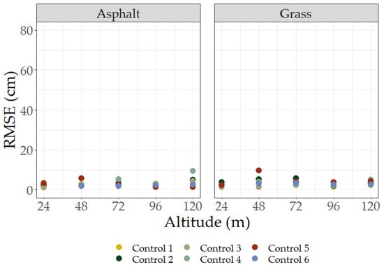RMSE by altitude for all occupations of the control site. Graphs are separated by ground surface type. Linear regression indicated the relationship between RMSE and altitude was not significant at alpha = 0.05 for the control site observations.