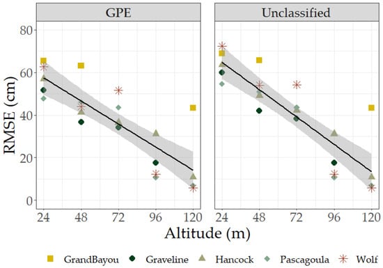 RMSE by altitude for marsh site data. Graphs are separated by LiDAR ground classification type. Adjusted r2 values for GPE and Unclassified datasets were 0.67 and 0.75, respectively. The shaded area represents a 95% confidence interval.