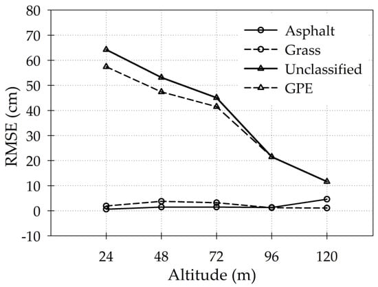 For the control site transect, there was no significant relationship between altitude and RMSE (Figure 6). RMSE values of these data ranged from 1 cm to approximately 10 cm. There was no consistent difference in RMSE between grass and asphalt surfaces. For the marsh site transects, RMSE decreased with increases in altitude (Figure 7). Unclassified data had higher RMSE values than GPE classified data for the lower altitudes and then shared the same RMSE value for the altitudes of 96 and 120 m.