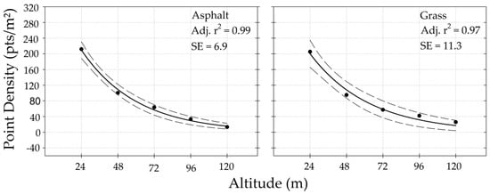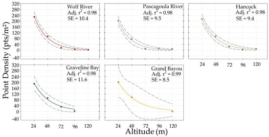 Areal density of LiDAR returns among all datasets decreased exponentially with increase in altitude AGL (Figure 9 and Figure 10). For the control site, adjusted coefficient of determination (r2) values were ≥0.97 for both paved and grass surface types (Figure 9). For altitudes greater than 48 m at marsh sites, most datasets consisted primarily of 0° scan angle returns with few off-nadir returns. Adjusted r2 values for marsh datasets were ≥0.98. For the control and marsh sites, some buffers were excluded from analysis due to an absence of LiDAR returns (Table 2).
