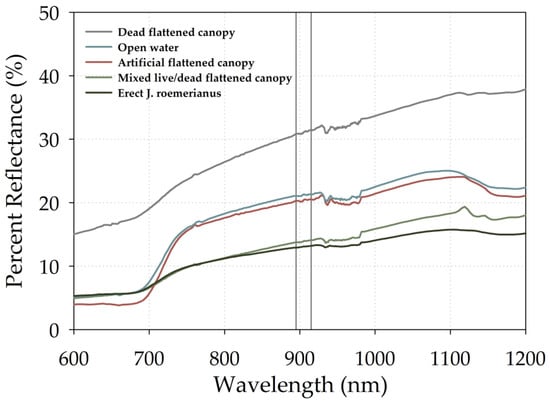 Spectral reflectance curves of different marsh surface types obtained at the Wolf River survey site. Percent reflectance values were computed as an average of 5–10 measurements. Vertical reference lines represent the operating wavelengths of the LiDAR sensor. Over the operating wavelengths of the sensor, dead flattened canopy reflectance values were highest, followed by artificially flattened canopy and shallow (<10 cm) open water, with mixed live/dead flattened canopy and erect live canopy exhibiting the lowest reflectance values.
