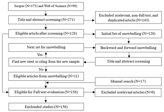 As of May 2023, the Scopus and Web of Science databases revealed a total of 173 and 98 articles, respectively. The selected publications were then evaluated and assessed using the systematic reviews and meta-analyses (PRISMA) process (see Figure 3) [26]. Following this method, 143 papers were eliminated because they were duplicated, irrelevant, or did not have a complete text accessible. After reviewing the whole texts of each included article, 128 articles met the inclusion criteria. The backward and forward snowballing methods were then used to find more studies that were not found using Scopus or Web of Science searches [27]. In addition to the manual search, this search method yielded 26 more relevant articles, for a total of 154 articles suitable for inclusion.