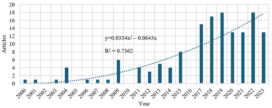 Figure 4 depicts the overall number of landslide-monitoring-related papers published each year. From 2000 to 2016, the average yearly publishing rate was approximately two articles. Between 2017 and 2023 (until May 2023), the publishing rate increased significantly to record an average annual publishing rate of approximately 15 articles. The figure’s second-degree polynomial trend line (refer to the trend equation presented in Figure 4) depicts how landslide monitoring has evolved. This trend is not surprising considering the world’s growing concern over the loss of human life, property, and economic resources due to landslides.