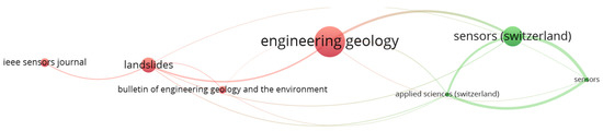 The VOSviewer tool can now highlight the journals that frequently publish landslide-monitoring articles. As a consequence, this will help researchers choose a reputable journal in this field. When utilizing the VOSviewer program, the author employed two thresholds: a source has to include at least five documents and at least 10 citations. “Sources” were employed as the unit of analysis, and “bibliographic coupling” was the type of analysis. As a result, 7 journals out of 62 hit the threshold (Figure 5). In Figure 5, the node size illustrates the influence of journals as weighted by the number of citations. The overall link strength of a journal represents the number of links it has with other journals [25]. Engineering Geology was the most widely published and cited journal and had 449 citations and 12 publications.