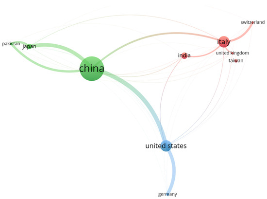 Understanding the scientific collaboration network makes it simpler to identify top laboratories, organizations, and nations. Furthermore, academic and industry practitioners seeking innovative landslide solutions should be aware of the cooperation network of nations investing more in this field. The aforementioned criteria were utilized, using “countries” as the unit of analysis and “bibliographic coupling” as a type of analysis. Only 10 of the 43 nations met the criterion. Figure 6 depicts the most frequently publishing nations, with China, the United States, and Italy having the most publications globally, with 50, 23, and 23 articles, respectively. Table 2 reports the top five institutions involved in landslide monitoring by using “bibliometric coupling” as the kind of analysis and “organization” as the unit of analysis. With five papers and 76 citations, the most frequently contributing institute was the School of Civil Engineering of Chongqing University, China.