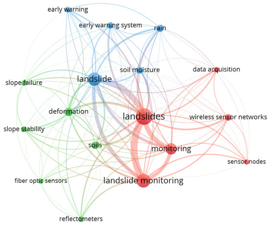 By selecting “co-occurrence” as the kind of analysis and “all keywords” as the unit of analysis, VOSviewer software version 1.6.20 can identify the most frequently used keywords (i.e., the keywords used in literature). In this analysis, the author fixed the minimum number of occurrences at 10; only 17 keywords out of 1050 matched this requirement. The size of a keyword node correlates to its occurrence frequency. To illustrate, the most commonly used terms were “landslides” and “landslide monitoring,” which had the largest node sizes of any keywords. Figure 7 highlights that there were three distinct clusters: green, blue, and red. The blue clusters show monitoring related to rainfall and soil moisture; the red clusters highlight keywords linked to monitoring sensors and wireless networks; and the green clusters highlight subsurface displacement monitoring systems, such as optical fiber techniques.