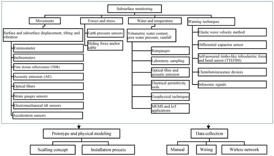 Landslide monitoring can be divided into two main categories: (1) surface- and (2) subsurface-monitoring techniques. In the following sections, both surface and subsurface monitoring are illustrated in detail. Figure 8 lists the surface-monitoring techniques, while Figure 9 presents the subsurface-monitoring process, including the testing procedure and data transfer mechanism. This paper first discusses the existing surface-monitoring approaches (refer to Figure 8 and Section 4.1), which have been well evaluated in the literature (refer to Table 1). Then, an in-depth investigation of subsurface procedures (such as movement, forces and stresses, water and temperature, and warning techniques) is presented. The warning approaches are subsurface monitoring devices that simply give a warning indication and no quantifiable data. The subsurface monitoring system is consistent with data-collection challenges, as well as prototype and physical modeling systems that are assessed to present a complete picture of such a topic (see Figure 9).