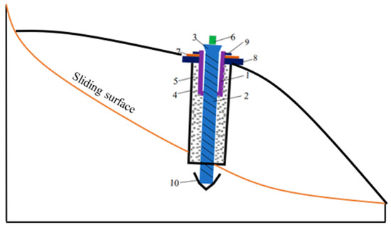 The AE flexible monitoring system: (1) sleeve with inner wall threaded; (2) anchor cable; (3) conical metal head; (4) rubber tube; (5) backfill material; (6) AE transducer; (7) ring dynamometer; (8) pedestal; (9) nut; (10) anchoring end (Modified from Deng et al. [56]).