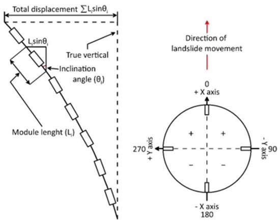 Surface displacement can be measured using various techniques, such as total stations, global positioning system (GPS) [38], robotized total station (RTS) [39], light detection and ranging (LiDAR) [16], synthetic aperture radar (SAR), interferometric synthetic aperture radar (InSAR) [40], persistent scatterer interferometry (PS-InSAR) [41], differential synthetic aperture radar (SAR) interferometry (DInSAR) [42], ground-based InSAR (GB-InSAR) [43], terrestrial laser scanning [44], global navigation satellite system (GNSS) [19], aerial photography [45], and satellite remote sensing techniques [46]. These techniques can only provide information about ground movements and are useful for wide-area surveillance. However, such instruments cannot determine the subsurface physical mechanism of landslides [14,15,16,19,20,47,48].
