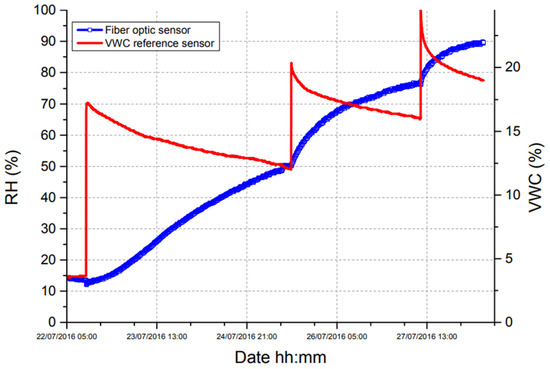 - Leone, M.; Principe, S.; Consales, M.; Parente, R.; Laudati, A.; Caliro, S.; Cutolo, A.; Cusano, A. Fiber optic thermo-hygrometers for soil moisture monitoring. Sensors 2017, 17, 1451. [Google Scholar] [CrossRef] [PubMed]