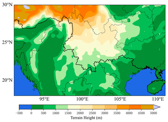The research area in this study covers 91–111°E and 18–30°N, as shown in Figure 1. As can be seen, the southwestern area of China can be clearly divided into three distinct geographic units: the Sichuan Basin and its surrounding mountainous areas with elevations below 500 m, the Yungui Plateau and its mountain ranges and hills with elevations around 2000 m, and the Tibetan Plateau, with elevations mostly exceeding 4000 m (reaching over 5000 m in some areas). In general, Southwest China exhibits considerable topographical variations, with elevations gradually decreasing from west to east.