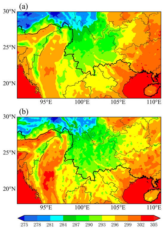 Spatial distribution of SKT (unit: K) of the background at (a) 0000 UTC and (b) 1200 UTC on 2 September 2021.