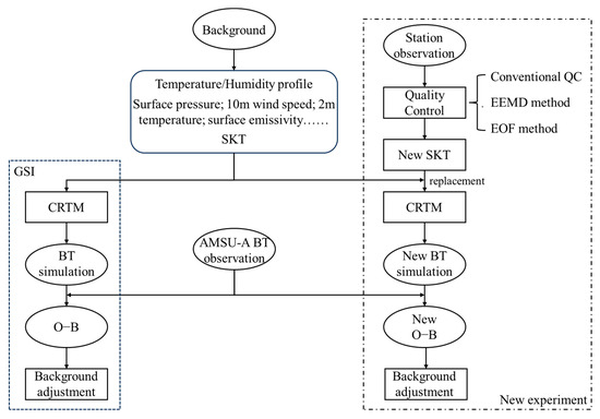A flow chart of the GSI data assimilation process used in this paper is shown in Figure 3. In the GSI assimilation system, the Community Radiative Transfer Model (CRTM) uses meteorological elements from the background to simulate BT at AMSU-A observation points. These meteorological variables mainly include atmospheric temperature and humidity profiles, 10 m wind speed, surface pressure, SKT, and so on. The assimilation process of the original GSI system is shown on the left side in Figure 3.