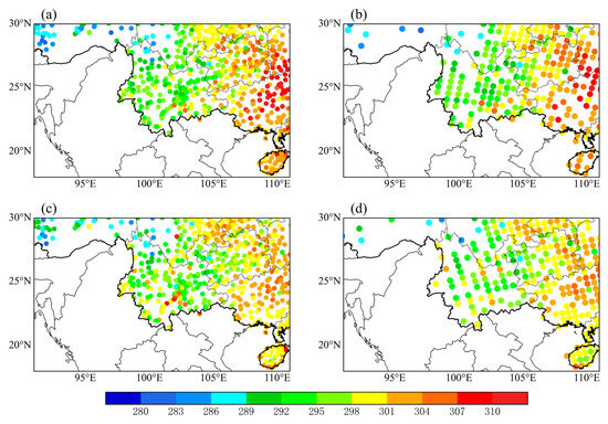 Spatial distribution of SKT (unit: K) observed by (a,c) AWS and (b,d) matched NOAA-19 observation points at 0000 UTC (upper panels) and 1200 UTC (lower panels) on 2 September 2021.