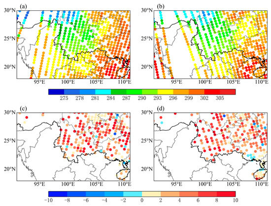 For the AMSU-A data that could be successfully matched on both occasions, the temperature differences between the observations and simulations are shown in Figure 5c,d. Apparently, the SKTs observed by the AWS are generally higher than the simulations, with the maximum difference exceeding 10 K.