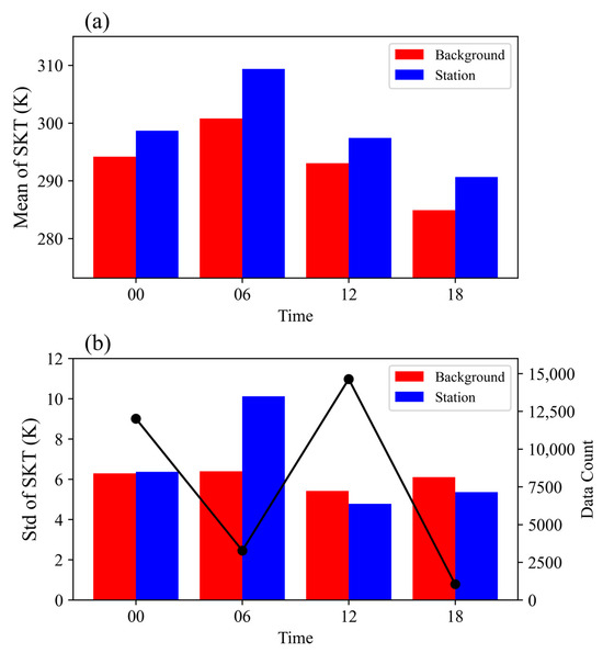 (a) Mean,(b) standard deviation (Std) and data volume values (solid lines in (b)) of the background SKT (red) and the AWS observations (blue) at satellite observation points at different times from 1 to 15 September 2021.