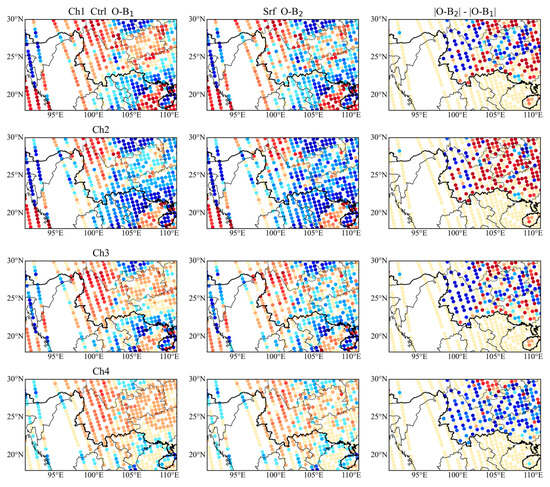 Spatial distribution of O–B (observation minus background) values (unit: K) in experiment Ctrl (O–BCtrl, left column) and Srf (O–BSrf, middle column) experiments, and the |O–B| difference (unit: K) between two experiments (|O–B|Srf–|O–B|Ctrl, right column) at 1200 UTC on 2 September 2021.