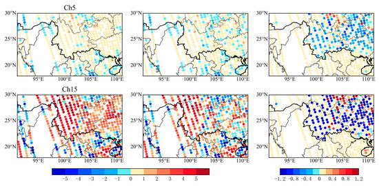 In order to evaluate the impact of the AWS observations on the BT simulations, the BT bias (observation minus background, i.e., O–B) between the Ctrl and Srf experiments needs to be analyzed. Taking the NOAA-19 satellite data as an example, Figure 7 displays the spatial distribution of the O–B values from both the Ctrl and Srf experiments at channels 1–5 and 15 of the AMSU-A at 1200 UTC on 2 September 2021, as well as the absolute difference between them (|O–B|Srf–|O–B|Ctrl). Obviously, in channels 1–2, most of Southwest China shows positive values. This indicates that the BT simulation results of the Srf experiment deviate from the observations more than those of the Ctrl experiment, revealing a certain negative effect in terms of replacing the AWS data in these two channels. Although channel 3 shows negative values in Yunnan and Guizhou, a slight improvement can be found when considering the AWS data in the entire southwestern area. In terms of channels 4–5 and 15, the |O–B|Srf–|O–B|Ctrl values are negative in all areas except for the eastern part of Sichuan, indicating that the AWS data were able to considerably enhance the accuracy of the BT simulation in these three channels. Furthermore, as the weighting function peaks of the AMSU-A channels shift from the surface (channels 1–3) to 700 hPa (channel 5), the impact of SKT variation on the BT simulation gradually decreases, but it could still continue to improve steadily.