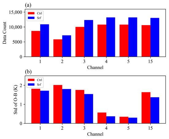 To ensure assimilation effectiveness, we performed a relatively stringent quality control procedure for the data assimilation system to eliminate suspicious data. Figure 8a provides the numerical volume of satellite observations retained after the GSI quality control process was carried out, and the AMSU-A data of the NOAA-15/18/19 and MetOp-A are included here. The Ctrl experiment had fewer observations in the AMSU-A window channels, particularly in channel 2, compared with the sounding channels. The replacement of the SKT with the AWS data resulted in a noticeable overall increase (approximately 30%) in data volume. Figure 8b shows the standard deviation of the O–B values from the Srf experiment for each channel after quality control. As presented in Figure 8b, the O–B standard deviations for each channel in the Srf experiment are remarkably smaller than those in the Ctrl experiment, indicating that the observation error was greatly reduced after replacing the SKT data from the AWS.