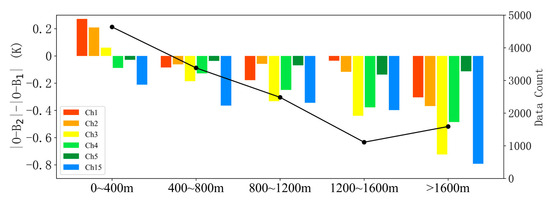 Figure 11 shows the absolute difference of the O–B between the two experiments (|O–BSrf|–|O–BCtrl|) and the data volume at different terrain elevations. Different channels are indicated by different colors. It is noticeable that the majority of the observations are concentrated below 1200 m. For different terrain elevations, except for channels 1–3 in areas below 400 m, most channels show negative values for the |O–BSrf|–|O–BCtrl|, indicating the positive impact of the replacement of SKT data from AWSs. Furthermore, as the terrain elevation increases, the influence of SKT observations on the BT simulation gradually intensifies; this trend is most pronounced in the results of channels 3 and 4. Particularly, for areas with terrain elevations above 1600 m, almost all channels demonstrate a most pronounced improvement compared with the other areas below 1600 m. Although channel 5 exhibits relatively low variations at different terrain elevations, it shows a slight influence of terrain elevation on the BT simulation compared with the other channels. This could be attributed to a higher weighting function peak in channel 5 despite the overall improvement.