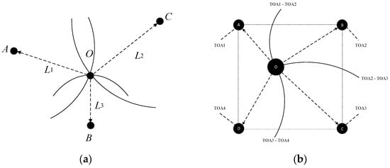 (a) Trilateration-based location calculation. (b) Hyperbolic-lateration-based location calculation.