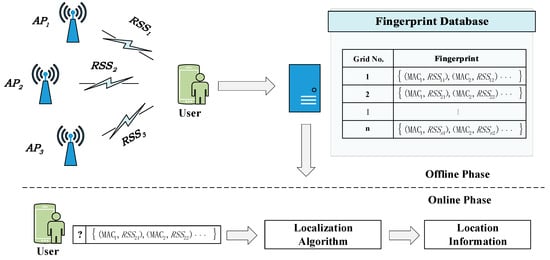 The fundamental principle underlying high-precision positioning based on fingerprint matching involves computing the disparities between the measured data and the reference fingerprints stored in the database to achieve the closest match. The positioning process encompasses an offline phase and an online phase, as depicted in Figure 4. In this context, , , and denote signal access points, while , , and represent received signal strengths. and correspond to the media access control (MAC) addresses associated with and , respectively. and indicate the signal strengths of and within the grid, respectively. During the offline collection stage, distinctive features are extracted from the raw signals. Subsequently, in the learning stage, these features undergo processing to establish a database or a corresponding mathematical model. In the positioning stage, real-time features acquired during the process are combined with the learned database or data model to determine the real-time location accurately. Fingerprint features are derived from a variety of sensors, including magnetic field features, cellular signal features, Wi-Fi signal features, visual image features, radar point cloud features, and more. The focus of this paper revolves around introducing fingerprint-based localization methods that leverage magnetic field features and CSI features.