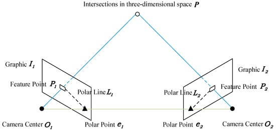 Visual odometry (VO), also known as visual simultaneous localization and mapping (SLAM), is the front end of SLAM. Its objective is to establish matching relationships between observed data [85]. It gained popularity in 2004 and serves a similar purpose to wheel odometry. It estimates the motion parameters of a mobile robot incrementally, but instead of relying on wheel rotations to measure distance traveled, VO utilizes images captured using cameras, making it less affected by adverse terrain conditions. Corresponding points are selected for feature matching between images, and based on the coordinate changes of these points between consecutive frames, the camera’s pose change is estimated, and the motion trajectory is constructed [86]. In the case of a monocular camera, the camera’s motion is estimated based on two sets of 2D points using Epipolar Geometry, as illustrated in Figure 5. The pose estimation stage can be divided into direct and feature-based methods. The direct method utilizes all image information and minimizes the grayscale error between adjacent frames based on the brightness constancy assumption for corresponding points to estimate the pose. The feature-based method involves extracting feature points from each frame and then matching them using descriptors or optical flow [87] to establish positional associations between different images for pose estimation.