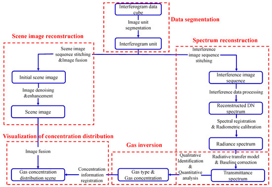The data processing route is divided into two parallel paths: image and spectrum. The image is divided into different interferogram units according to interference orders. In the image processing route, the interferogram units of the same interference order in each image are arranged in the order of the scanning direction to obtain a scene image sequence. Then, image stitching and fusion are carried out to obtain the initial scene image. Finally, image denoising and enhancement are performed to obtain the final scene image. In the spectral processing route, the interferogram units of the same target with different interference orders in each image are stitched according to the OPDs sequence to obtain the interference image sequence of the target. Then, the interference image sequence is resampled, and interferometric intensity baseline correction, apodization, phase correction, and Fourier transform are performed to obtain the digital number (DN) spectrum. It is then subjected to spectral and radiometric calibration to obtain the target radiation spectrum, which is substituted into the radiation transfer equation, and the transmittance baseline correction is performed to obtain the transmittance spectrum. Gas information inversion is performed using the transmittance spectrum of different spectral resolutions and wavenumber intervals obtained via the dual-interference channels to obtain the target material type and concentration information. Finally, the inversion information is registered and fused with the scene image to obtain the gas concentration distribution image.