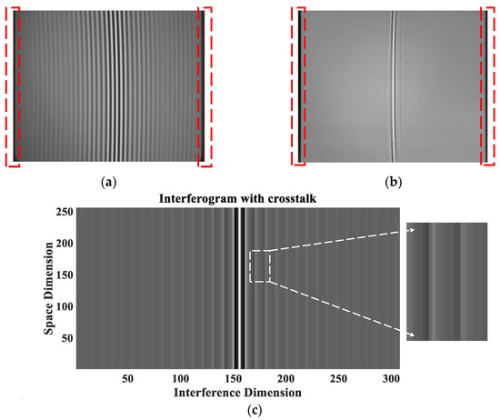 Due to unavoidable magnification errors in the imaging system and misalignment of the optics, the interferometric image does not fill the entire detector image plane, resulting in redundant columns of pixels on both sides of the interferogram, as shown in the dotted boxes in Figure 6a,b, which will cause some interferogram units to be modulated by adjacent different interference orders, resulting in light intensity crosstalk and aliasing of interferogram units, further causing uneven distribution of interference fringes and inability to obtain complete interference information, as shown in Figure 6c. Therefore, it is necessary to resample the interferometric intensity sequence to accurately match the target interferometric intensity with its OPDs.