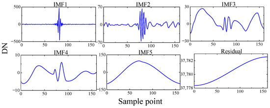 The interferometric intensity sequence collected by the high-resolution interference channel (the principle of the broad-band interference channel is the same) is decomposed using EMD to obtain five IMF components and a residual r(δ), as shown in Figure 8. IMF1, IMF2, IMF3, and IMF4 are high-frequency signals. IMF5 and the residual constitute the trend term that causes the baseline drift of the interferometric intensity sequence.